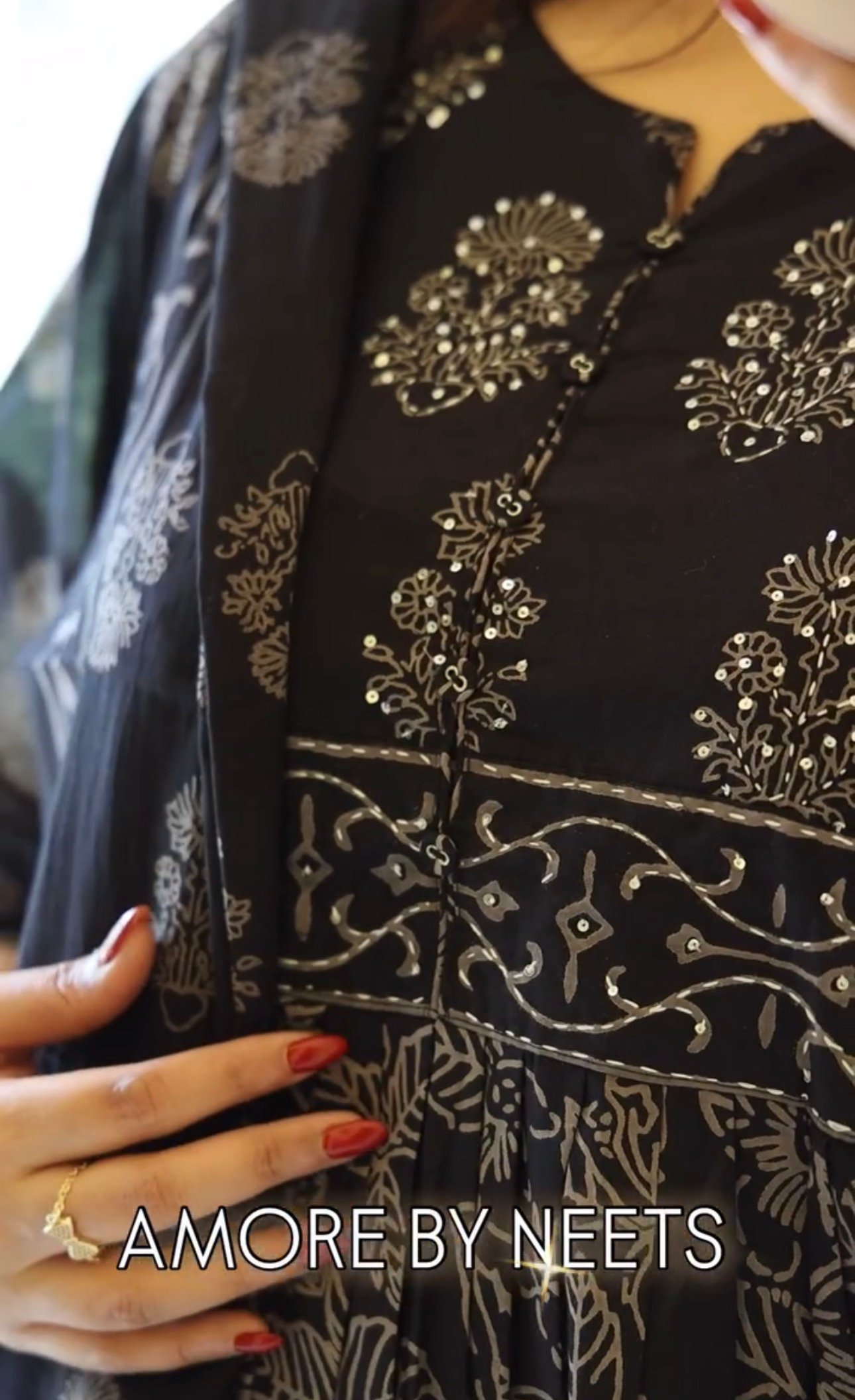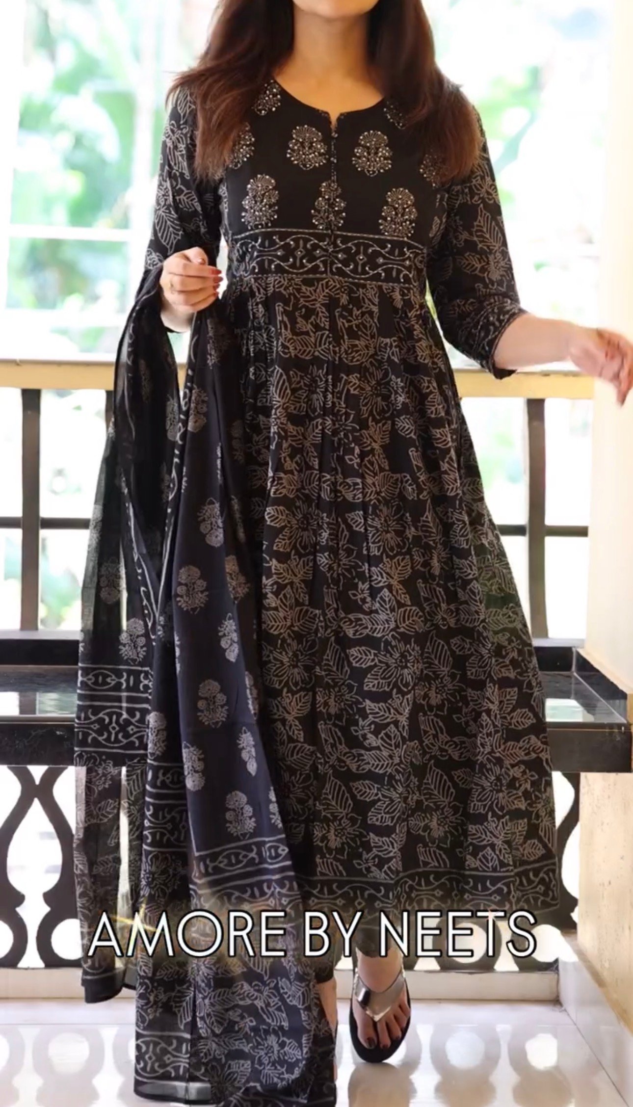 Arayna Women’s Cotton Block Printed Kurta Set with Palazzo Pants & Dupatta, Black